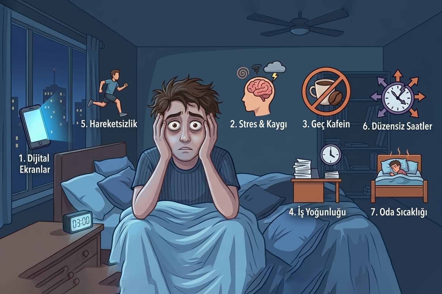 Gece uyuyamama; genellikle stres, anksiyete, düzensiz uyku alışkanlığı, yanlış beslenme, manevi sebepler, ekran kullanımı ve bazı hastalıklar nedeniyle ortaya çıkar.